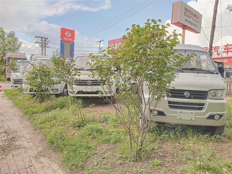 记者发现,沿着农机大市场一直到大耿家转盘道方向两侧绿地内,每隔一段距离就会有一家售卖农用车或货车的店面,而这些店面的代售车辆多多少少都会停放在绿地上。记者粗略数了一下,一路上不下百余台车辆霸占绿地,绿地内的草木不同程度受到了破坏。随后,记者将此情况反映给松北区综合行政执法局,工作人员表示会立即协调相关人员进行处理。对此,生活报将持续关注。