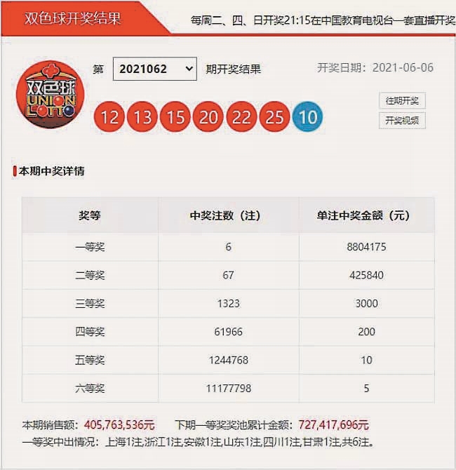 6月6日晚,中国福利彩票双色球游戏进行第2021062期开奖。本期双色球红球号码为12、13、15、20、22、25,蓝球号码为10。