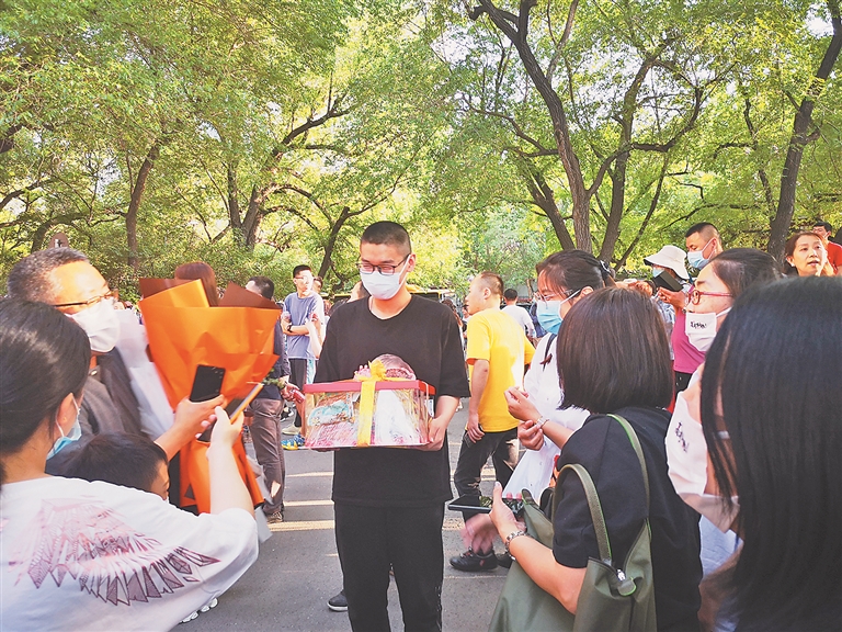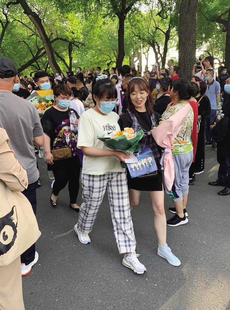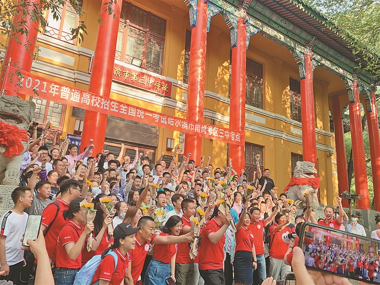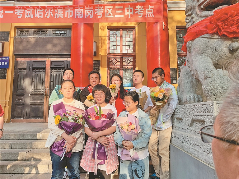 生活报讯 (实习生郭佳鑫 见习记者崔凯歌 记者吕晓艳文/摄) 8日下午,高考最后一科英语考试接近尾声时,哈三中考点的围栏外站满了等待考生的家长,他们中许多人穿着旗袍、手捧向日葵花束,举着停留在录像界面的手机,焦急地想要记录下“战场”归来的“小战士”们出考场的身姿。下午5点整,伴随着考试结束铃声的响起,考生陆陆续续走出考场,家长群中爆发出一阵不小的欢呼。2021年高考,至此落下帷幕。