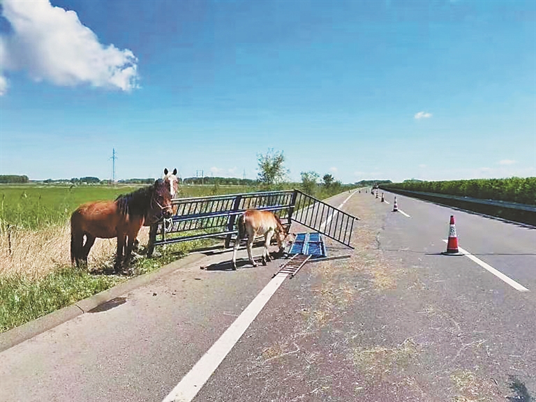 民警考虑到路程较远、路上耗时较长,且马匹只能固定牵引2匹,其余马匹有极大可能串入车道造成事故。为了杜绝发生次生事故,保障公路安全通畅,民警与路政管理人员商议,现场距离昂昂溪收费站3公里,可将车辆散落栏杆和其余物品放置高速公路栏杆外侧,由驾驶人牵引马匹,民警和路政方面分别用两台车对剩余马匹疏导、牵引,并对过往车辆进行警示等方法。