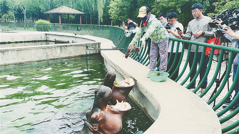 同样来自非洲的河马一家三口,在吃的方面可谓是志趣相投,吃起粽子格外香。水果粽、蔬菜粽、杂粮粽、混合粽,啥馅都爱。不管多大的粽子,轻轻松松一口吃掉。等待饲养员投喂粽子的时候,河马庞大的身躯轻巧地并列浮于水面,三张大嘴齐张等候美味的场景,令人忍俊不禁。