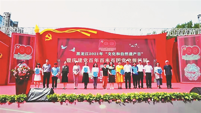 生活报讯 (记者吴海鸥 薛宏莉)一百米长卷,一百幅剪纸,一百年奋斗与辉煌。为庆祝中国共产党成立100周年,“黑龙江2021年‘文化和自然遗产日’暨庆建党百年百米百图党史剪纸展”,6月12日在哈尔滨防洪纪念塔前广场隆重启幕。本次活动由黑龙江省文化和旅游厅、中共黑龙江省委史志研究室、哈尔滨市文化广电和旅游局共同主办,黑龙江省非物质文化遗产保护中心、哈尔滨市非物质文化遗产保护中心共同承办,开幕式后还举行了龙江非遗人献礼建党100周年《同心向党 爱我中华——少数民族歌舞秀》文艺专场演出。