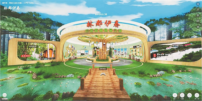 林都伊春VR展厅以“森林里的家”为主题,规划面积1000平方米,整体风格体现了小兴安岭大自然的气息。展厅分7个展区:旅游康养、森林食品、绿色农业、招商推介、木艺玛瑙、工业和科技创新、北药产业,共推介了30余家重点企业,展出具有本地特色的名优产品。