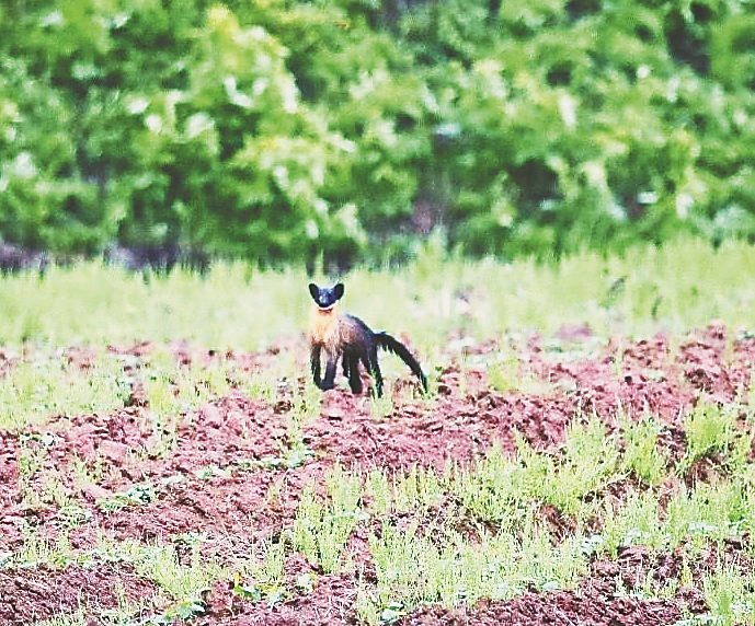 据宋惠东介绍,此次行程是东北林业大学普通动物学鸟兽分类学课程下设置的野外实习,当天他们几位老师带领学生在帽儿山林区“看鸟看蝴蝶”,由于下了小雨,只能看得见鸟,林间没有蝴蝶的踪影。走着走着,在距离师生200-300米处的林子里突然钻出一个小身影。“距离较远看不真切,我以为蹿出来的是一只兔子,拿着长焦镜头对准它,在取景框里一看,竟然是黄喉貂!”体型细长、脑袋呈黑色、脖子下面呈现黄色,这些都是判断这只小动物是黄喉貂的外貌特征。这个小家伙与林大师生远远对望了一会儿,过了一两分钟,横向跑进了另一片林子里。