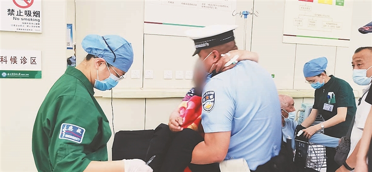 中队长顾吉兴立即带领民警驾车将其护送至哈医大二院急诊,14公里用时约14分钟。经询问得知,病人因腹部疼痛已无法行走,为节省借用担架时间,顾吉兴二话没说直接将病人抱送至急诊室。