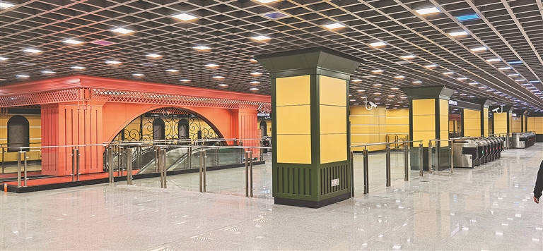 因为位于中央大街附近,所以该处地铁站更具地域风情,宽敞的进站大厅内通透明亮,特色吊棚、欧式立柱、粉色的中西合璧造型令人眼前一亮,侧面的墙壁上,奶黄色和绿色的欧风造型镶嵌电子图片,展现了哈尔滨的欧陆风情和历史,别有一番风情。相信,未来这里也会成为市民喜爱的网红打卡地。