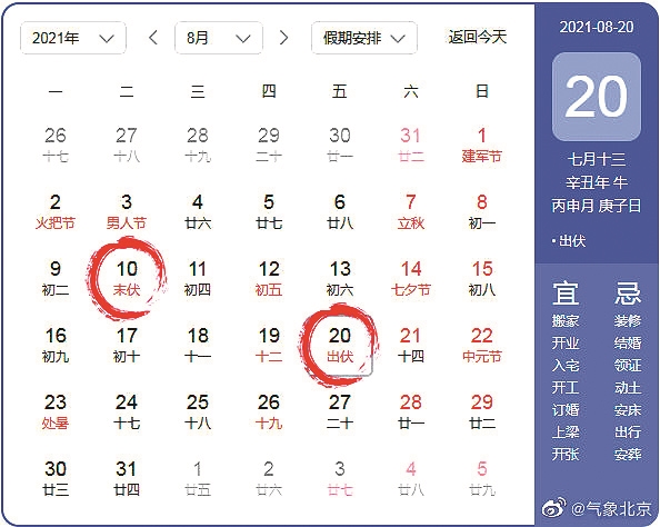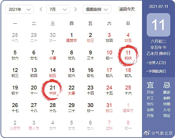 据气象北京 6月21日进入夏至节气。一般都说“夏至三庚数头伏”,那么今年从哪天开始数伏呢?看下日历,7月11日初伏,7月21日中伏,8月10日末伏,8月20日出伏。没错,今年又是40天的伏天儿。