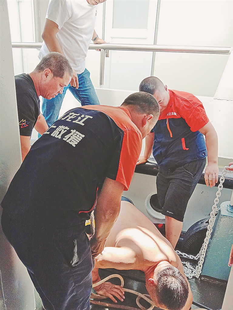 丁连发高声喊道:“你从船外边游过去,这边危险。”值班员王宇龙听到后迅速赶到甲板查看情况,他发现这位年迈的游泳者已经体力不支,只有头部露出水面,神色慌张,双手不时乱划,看起来随时有可能下沉。