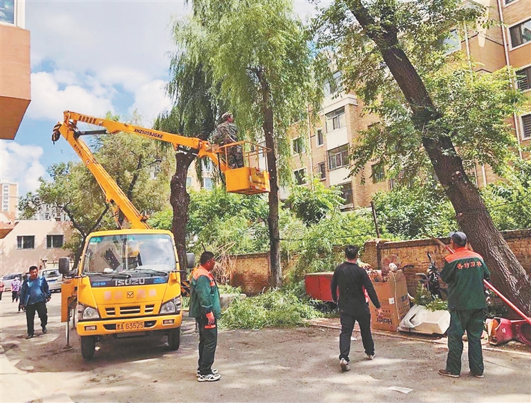 接到居民投诉后,新城街道办立即联系了香坊区园林办,为尽快解决树木遮光问题,香坊园林管护中心派出10余名工作人员对香城街3号进行了实地勘查,发现香城街3号院内树木不仅遮光严重,而且由于连续降雨,多处树木折断,存在严重安全隐患,因此决定立即对院内树木进行修剪和清障。