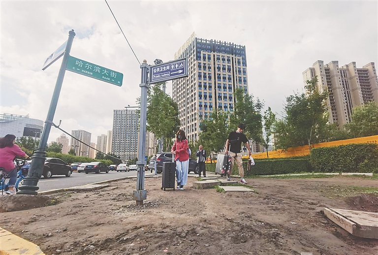 24日,记者在哈尔滨大街与西站西街交口看到,该交口约有200平方米没有铺砖,地面都是裸露的残土,此处距离哈尔滨西站和哈西客运站比较近,人流量较大,行人走到此处都得将行李箱拎起。