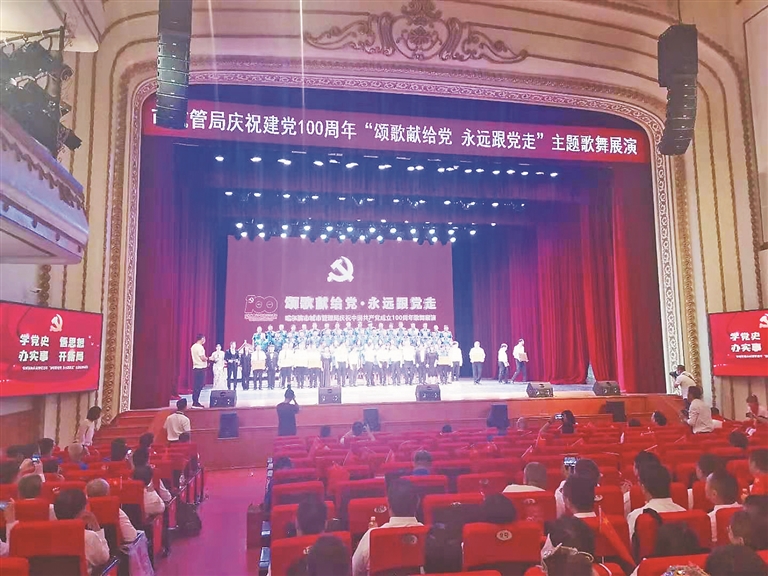 在奏响庄严的国际歌后,哈市城管局“颂歌献给党 永远跟党走 ”庆祝建党100周年主题歌舞展演在《盛世欢歌》的歌舞声中正式拉开序幕,来自哈市城管局机关和基层单位的9个表演队伍、500余名党员干部,以铿锵激昂的歌声和饱满真挚的热情,先后演唱了《我们走在大路上》、《我和我的祖国》、《没有共产党就没有新中国》,引领全场党员干部重温辉煌历程,凝聚奋进力量。