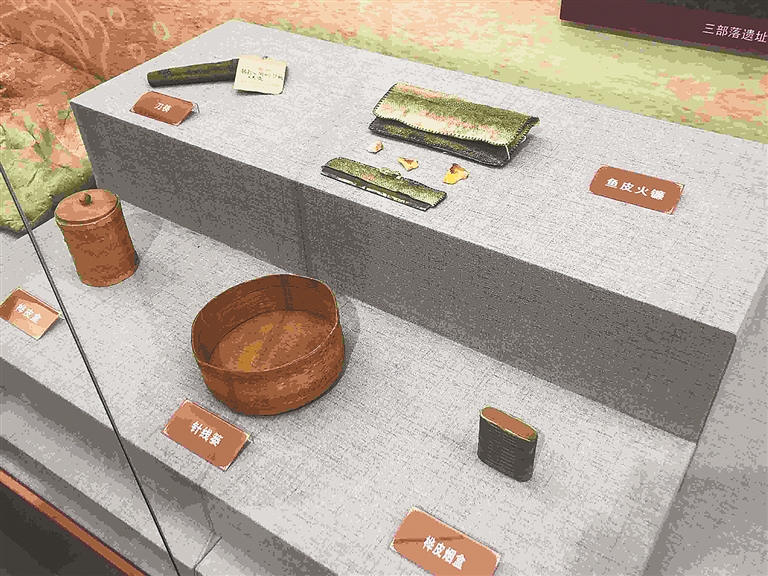 展览中,鱼皮火镰、桦皮烟盒、鱼皮服饰、三齿鱼叉、猎刀、吊锅等赫哲族特有的展品,都吸引了大量市民驻足拍照。