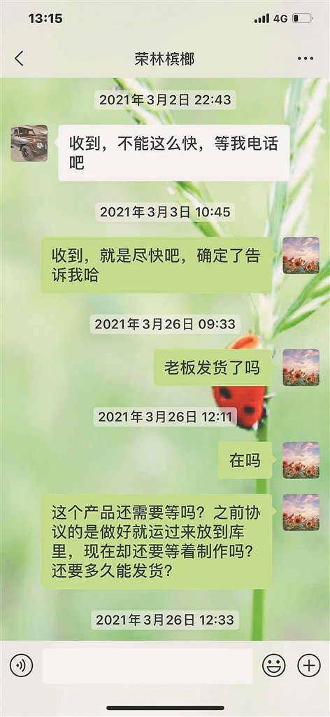 记者通过王女士提供的电话,联系到了荣麟槟榔负责人,负责人表示:“我确实欠人家货,这没说的,但也不是故意拖欠的,这期间赶上过年、又因为疫情耽误了几个月,至于货送晚了,就给人家赔偿,估计7月15日前肯定会将剩余的货物全部送到王女士家。”对此,生活报将持续关注。