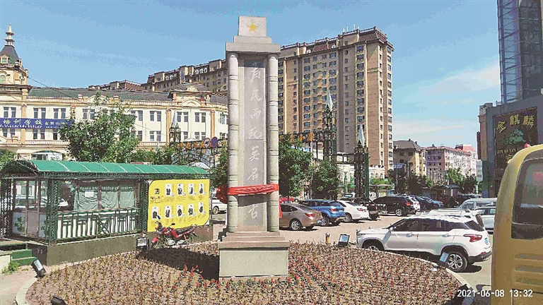 柳知一烈士的纪念碑就矗立在密山火车站前。走出火车站广场,街道的斜对面就是知一碑,几乎所有乘火车来到密山的游客,看到的第一个标志性建筑都是这座碑。