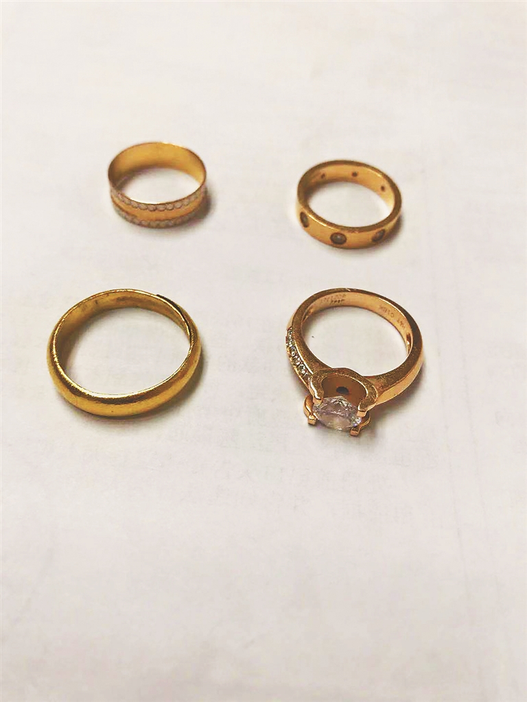发现戒指不见后,她出去找但是没找到,在服务员的帮助下,调取了停车场监控。“查看了半小时,发现一对岁数挺大的一男一女捡到了。然后洗浴就帮我报案了。”凌女士说,这4枚戒指中,有一枚是她1983年跟爱人订婚时,她婆婆给的黄金戒指;另一枚大约1.6克拉的钻戒,是十年前结婚纪念日买的。