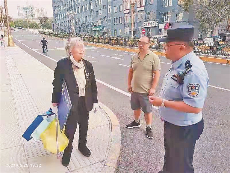 6月29日,哈市道里公安分局兆麟派出所民警接到110报警,在省报社门前有一位87岁老人找不到家了。民警孙立伟、 霍延涛接警后迅速赶到现场。见到老人后,发现老人说话吐字不清。民警耐心与老人沟通,终于得知老人叫李淑芬,住道里区公园街1号。民警一边在现场照顾老人,一边联系值班民警王东阳对信息进行研判,终于找到老人的儿子,并且安全将老人交给其儿子。据其儿子讲,老人已经离家失踪一整天了,全家一直在寻找焦急万分,多亏公安民警帮助他找到母亲。