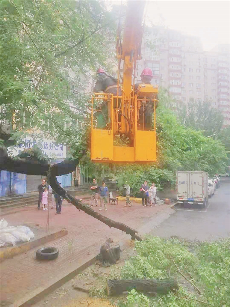 生活报讯(记者 李丹 )6月30日15时30分,接到哈尔市气象台暴雨红色预警信号,南岗区园林管理局迅速启动极端天气应急预案,加强巡视检查,全力备战应急抢险。16时30分,网格员巡视发现四明街一棵榆树分枝折断,砸到树下车辆,立即将情况上报。局属应急抢险队伍第一时间赶到现场,首先对断枝进行拆解作业,使受损车辆移出危险范围,随后锯除断枝,消除安全隐患,并清理现场,19时工完场清,回到班组继续待命。