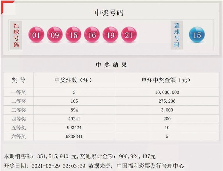 6月29日晚,中国福利彩票双色球游戏进行第2021072期开奖。当期双色球红球号码为01、09、15、16、19、21,蓝球号码为15。