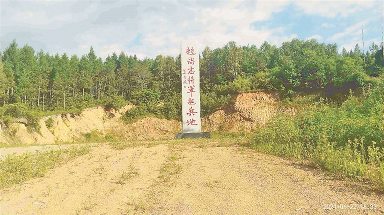 26日,记者步行上山,地面上是黄土和碎石垫道,沿途两侧相当静穆,能听到树叶随风摇曳的沙沙声。在坡上前行,眼前一座石碑逐渐崛起,这就是赵尚志将军起兵地的纪念碑。石碑高达十余米,由著名作家莫言题写碑文,2020年10月17日举行了纪念碑的揭幕仪式。