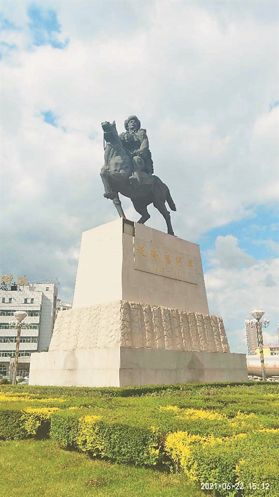 6月22日,北方已近盛夏,转盘道上的中心花坛绿篱茂盛,芳草如茵,将铜像烘托得更加伟岸。赵尚志将军一身戎装,表情刚毅,如同正在白山黑水间策马奔驰。