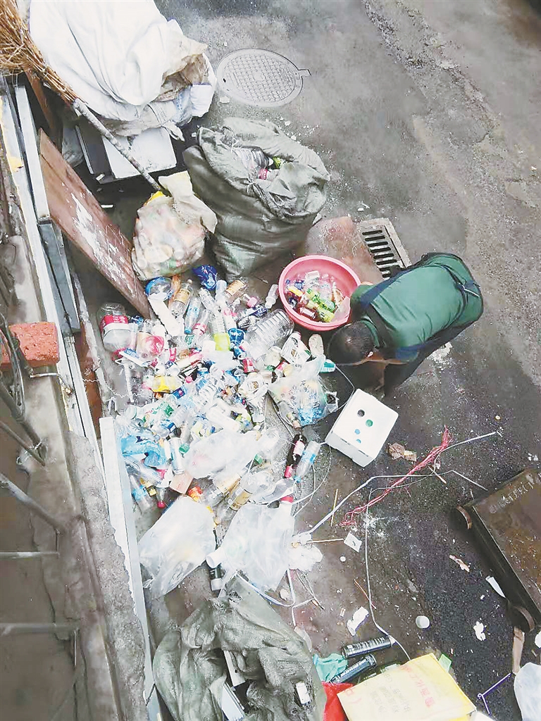 2日,记者来到现场看到,在北十三道街26号与28号中间,一楼有一个用木板搭的简易小棚子,下面是一个地下室。在棚子旁边的路边,堆着几个很大的袋子,袋子里装的都是空瓶子。在路中间放着一个秤,秤的旁边还堆放着一些正准备称重的废品。一名男子把一堆塑料瓶子铺在路边的地上,正一个一个地往盆里捡。不远处路边停着一辆货车,车上装满了大袋子,袋子里装着满满的废品。记者观察,此处没有悬挂任何执照,货车上也没有废品收购的标识。因为路的一边堆满了瓶子,另一边停着货车,使得本来就不宽的小路变得更加狭窄,仅能容一辆小电瓶车慢慢经过。