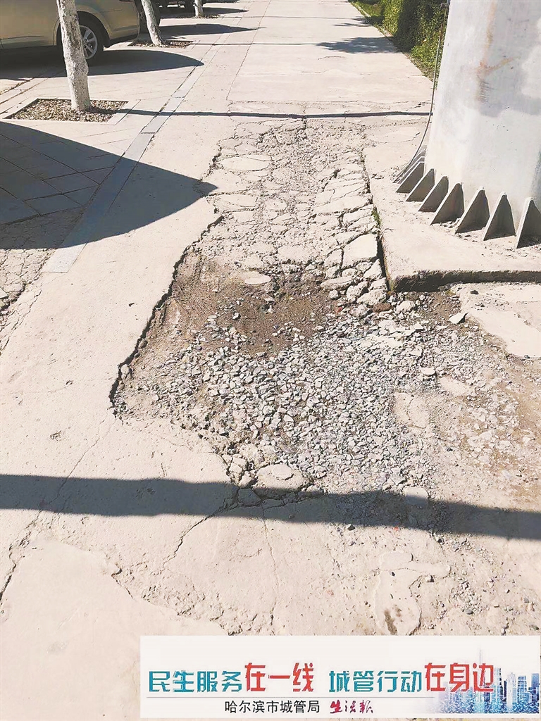 生活报讯 (见习记者刘维娜 记者李丹文/摄) 近日,由哈市城管局、生活报联合推出的“民生服务在一线 城管行动在身边”行动热线接到市民赵先生来电,在融江路辅路和四方台大道的交叉口,人行道破裂严重,影响出行,希望得到处理。