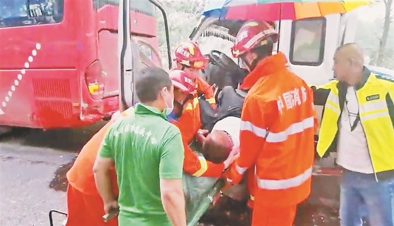 救援人员到达现场后进行初步勘察,发现现场为货车追尾客车,货车驾驶室形变严重,导致驾驶员被困车内。被困人员双腿被夹在方向盘与中控台之间,虽然尚有意识,但被卡住无法自行脱困。救援就是与时间赛跑,针对现场情况,现场指挥员立即将救援人员划分3个救援小组,警戒组负责在事故区域前后200米划定警戒区域,并引导其他车辆有序通行;灭火组出一支水枪,防止在救援过程中事故车辆突发火灾;救援组利用液压破拆工具对货车方向盘和中控台进行破拆、扩张,拓展被困人员的活动空间,最终救援人员将被困人员成功救出,全程仅用时5分钟,被困人员此时意识清醒,救援人员旋即将其移交给现场120急救车,送往医院进行进一步治疗。