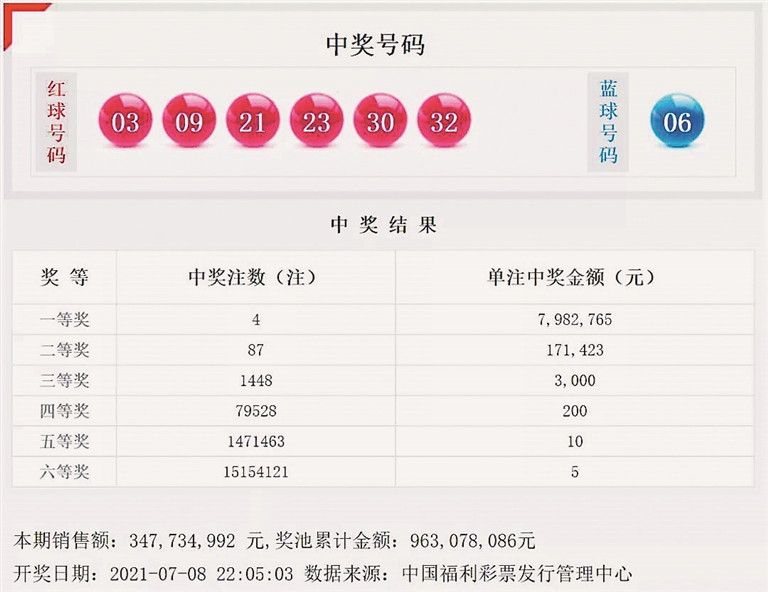转自中彩网 7月8日晚,中国福利彩票双色球游戏进行第2021076期开奖。当期双色球红球号码为03、09、21、23、30、32,蓝球号码为06。