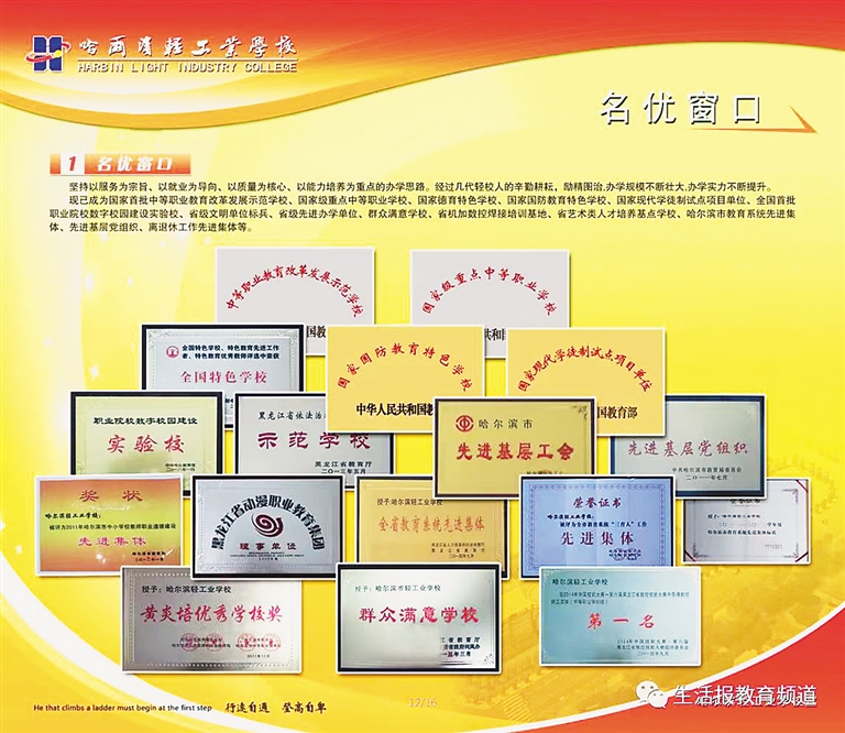 学校以中庸名句“行远自迩,登高自卑”为校训。在省、市乃至国家的中职学生专业技能大赛中,学校选手屡获殊荣,荣获国赛二等奖3项,国赛三等奖15项;省赛一等奖32项,省赛二等奖35项,省赛三等奖34项。学校创立了“引中华传统文化进课堂,以文明礼仪教育为平台,以军事化管理为引领,以校园文化活动为载体”的德育培养模式。培养的学生不仅具备较强的专业技能,其综合素质也得到了企业和社会的普遍赞誉。栽下梧桐树,引得凤凰来,近年来很多知名企业纷纷落户学校,与我校开展校企合作,建立学生实习就业基地。哈尔滨轻工业学校是致力于职业技术学习的莘莘学子的不二之选。