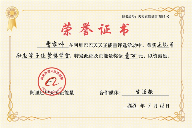 根据计划,曹家炜除了获得10000元奖学金外,还将获颁“阿里巴巴正能量校园大使”称号,其间阿里巴巴天天正能量还将持续关注他的学习和成长,并鼓励他积极投身校园公益事业。