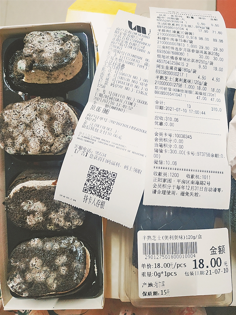 王女士表示,10日下午5点左右,她在平房区正阳家园超市购物时,在超市出口处一家烘焙店买了一盒半熟芝士蛋糕。回到家后,就把蛋糕放进了冰箱里。当晚10点左右,她把蛋糕拿出来吃,咬了一口,觉得味道不对劲。这时她才发现,盒子里四块芝士蛋糕全部大面积发霉。“这个芝士蛋糕是两面的,我买的时候,朝上的这面看不出什么问题,感觉味道不对劲的时候我才发现。”