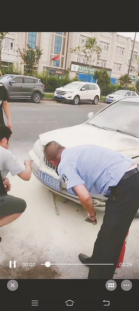 就在此时,该车辆前机器盖处,已由冒烟转变为明火,阚全立即拨打119,常涛拨打车上预留电话通知车主。由于明火从机器内部燃起,没办法直接用灭火器对准火焰根部喷射,常涛立即找来撬棍,撬开机器盖灭火,明火被第一时间扑灭。