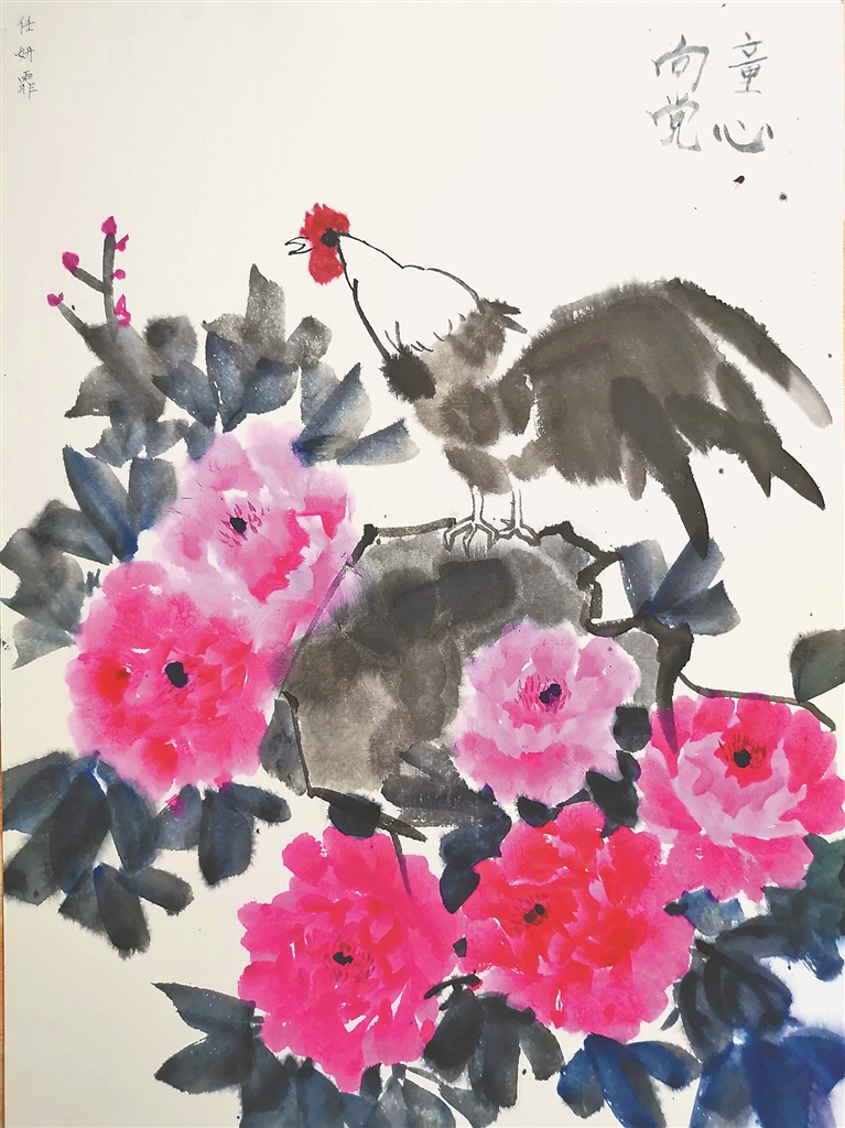 为庆祝中国共产党成立100周年,我画了一幅牡丹雄鸡。红色、粉色等颜色把这幅画点缀得不繁琐复杂,牡丹花在叶子的衬托下显得格外美丽。我爱我的国家,我爱中国共产党,祝福我的祖国更加繁荣昌盛。