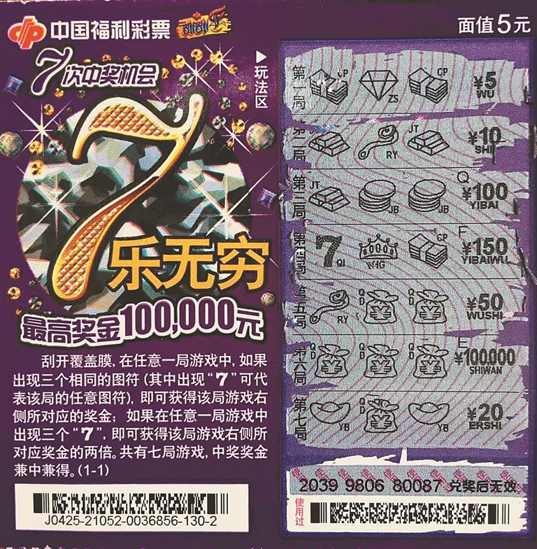 该彩票面值5元,头奖10万元,奖级10级,共有7次中奖机会,玩法亦与“7”紧密相连,在三同图玩法中,“7”是万能的,“7”可以替代任何图符,同时如果刮到三个“7”,奖金还可翻倍。