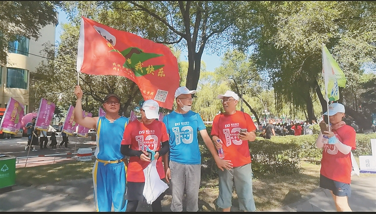 在终点,记者看到了一个十分有活力的团队,他们高举着自己团队的大旗,最引人注意的是他们是一个自带Bgm的团队,队长王思斌的背包里带着一个小小的音响,放着节奏感很强的音乐。记者采访了解到,这个团队的名字叫“我徒步我快乐哈尔滨户外徒步群”他们已经参加了四届徒步节,而队长本人已经参加过七八届,这个群中年纪最大的已经65岁了。