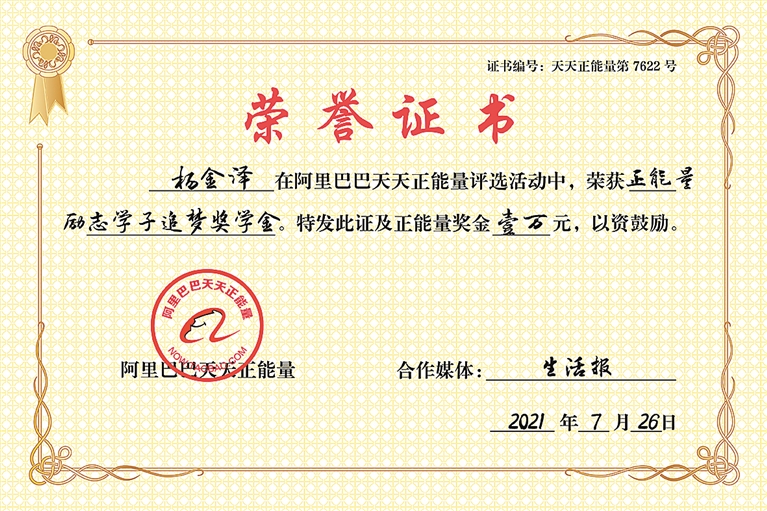 根据计划,杨金泽除了获得10000元奖学金外,还将获颁“阿里巴巴正能量校园大使”称号,其间阿里巴巴天天正能量还将持续关注他的学习和成长,并鼓励他积极投身校园公益事业。