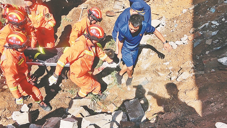 消防员深入土坑进行救援,用手将土剥开,将被困人员的头部、躯体和四肢露出,清理出空间,再用安全腰带将被困人员固定住,然后使用铁铤翘起压中右臂石头,指战员协力将被困者抬出。由于作业空间狭小,二次坍塌几率大,此次救援过程中救援人员只能用手一点一点地将土清理,由6名救援人员以接力的方式将土清理至周边。