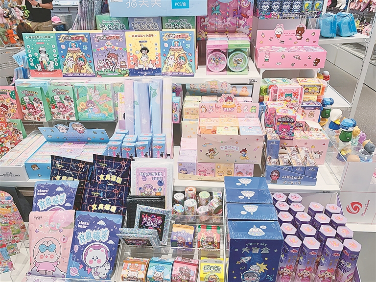 13时,记者先后走访名创优品、杂物社、三福几家店铺,这几家店都出售盲盒,并且在门口显眼的位置设置了三到五个展柜,展柜前都是年轻人在挑选、摇晃盲盒。盲盒玩具、盲盒文具、盲盒徽章、盲盒手链等一应俱全,设计精致的产品外盒整齐地堆满展示柜台、琳琅满目。店员告诉记者,盲盒笔虽然售价比普通中性笔贵,但销量更好。目前最受小学生欢迎的是叶罗丽系列的盲盒笔,售价5元,内里是普通的中性笔,外壳上印着时下小学生爱看的《精灵梦叶罗丽》的卡通人物,有十多种样式。另外,文具盲袋也十分受欢迎,A4大小的纸袋子上印着画风可爱的漫画以及文具盲袋四个字,看不出里面装了文具,售价在15元到25元不等,这家店里卖得最好的文具盲袋只剩下6个库存。