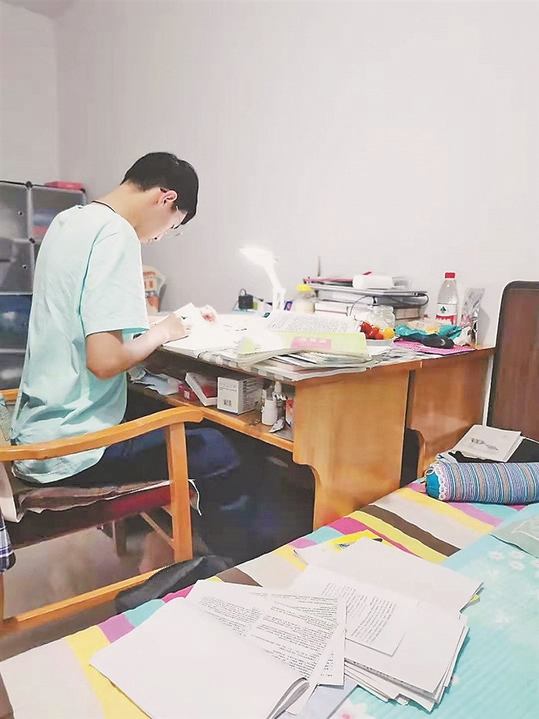 话虽如此,但是刻苦的王新宇从不放低对自己的要求。高二时,他觉得自己的学习成绩有所下降,为了不耽误寝室室友的休息,他每天半夜2点起来学习。“我们学校对休息时间把控得比较严,这个时间段就没有老师查了,我就偷偷起来看书。”住在一楼的王新宇,为了在寒冷的冬天能暖和点儿,每天都会跑到5楼的水房去学习,直到完成自己规定的学习任务。
