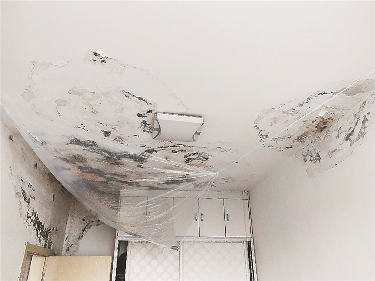 4日上午,记者来到张先生家,看到主卧室和储备间的棚顶墙皮大部分脱落,个别部位已经发霉,而漏雨严重的地方也用塑料布围了起来,下方放着盆。“我是2013年入住的,2016年房子开始出现漏雨的情况,而且越漏越严重,期间物业给小修小补过,但根本不管用,现在物业也不管了。”张先生说,他们一家人特别害怕下雨天,前段时间晚上下大雨的时候,家里人几乎一宿都不能睡觉,一人拿着一个盆接水,但也起不到多大作用,家里的很多家具被浸湿了,地板也被泡了。