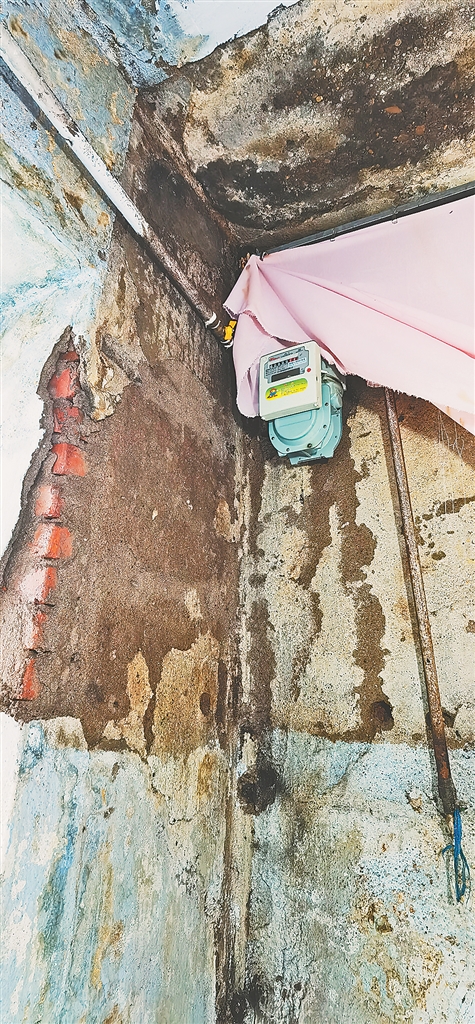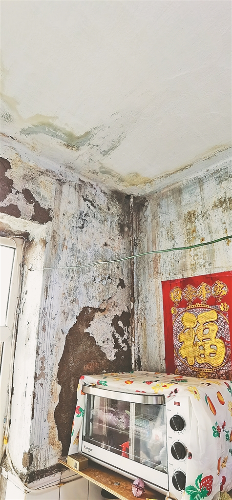 “前几天雨大,我正在厨房做饭,刚炒好一盘菜往屋里端,我刚转身没走两步,就听‘哐’一声,一大块近1米长的墙皮从房顶脱落,砸在电磁炉上,把电磁炉都砸裂了。”5楼住户马女士回忆起当时的情景仍心有余悸。