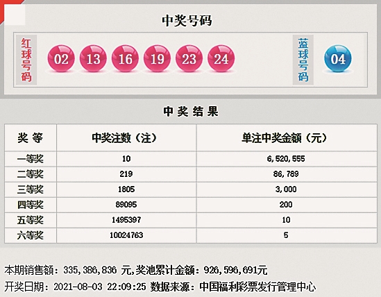 8月3日晚,中国福利彩票双色球游戏进行第2021087期开奖。当期双色球红球号码为02、13、16、19、23、24,蓝球号码为04。