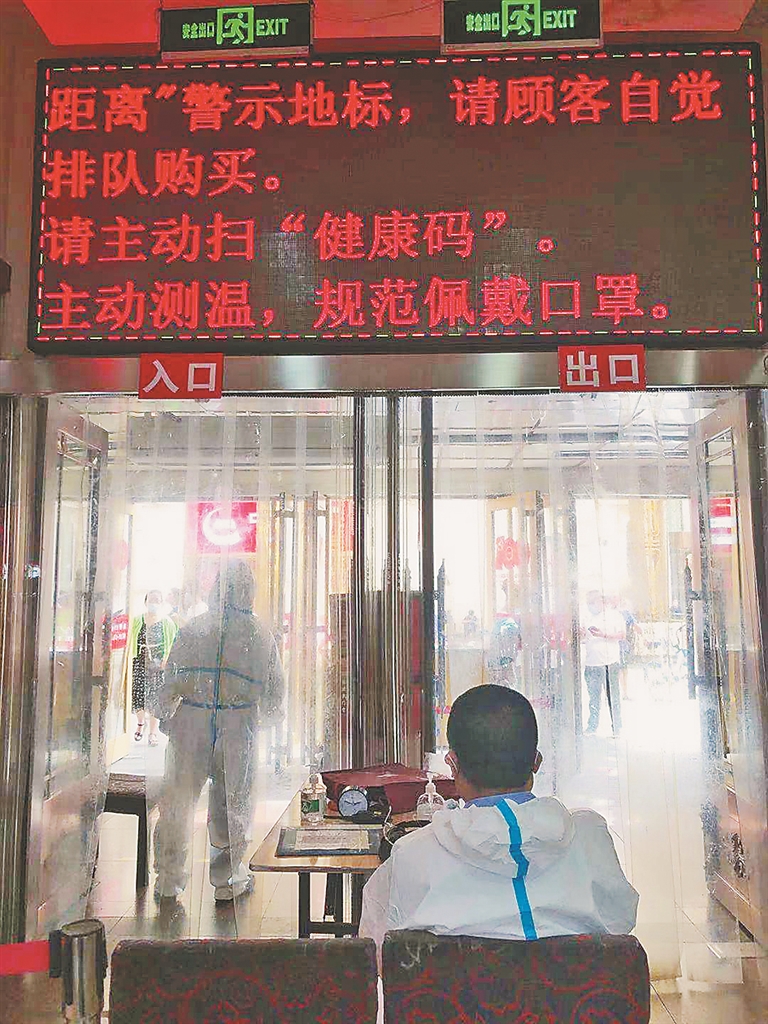 在道里菜市场和哈一百,都有工作人员在门口检查口罩佩戴情况和健康码信息,由于菜市场和哈一百很近,是两个相邻的门,有的顾客会说已经扫过了,但哈一百门口的工作人员依然会要求再扫一次健康码,桌上也放着免洗洗手液。