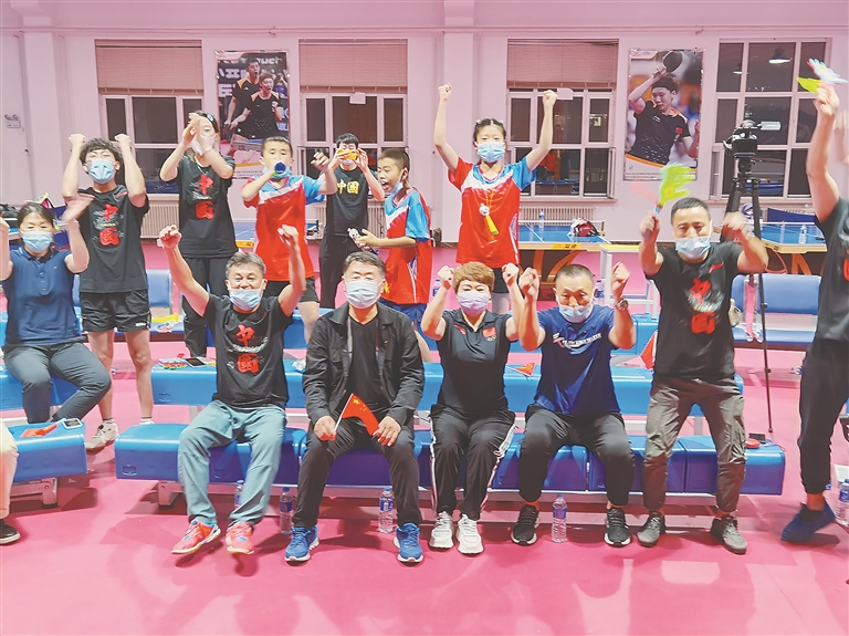在体校会议室,王曼昱的父母、王曼昱的教练韩连贵、刘晓东、吕忠峰及齐齐哈尔市体育局相关负责人、乒乓球小运动员代表等坐在电视机前收看直播比赛,为中国队加油助威。随着比赛的跌宕起伏,大家时而欢呼起立,时而热烈点评,当中国队最后赢得比赛时,全场一片欢腾!
