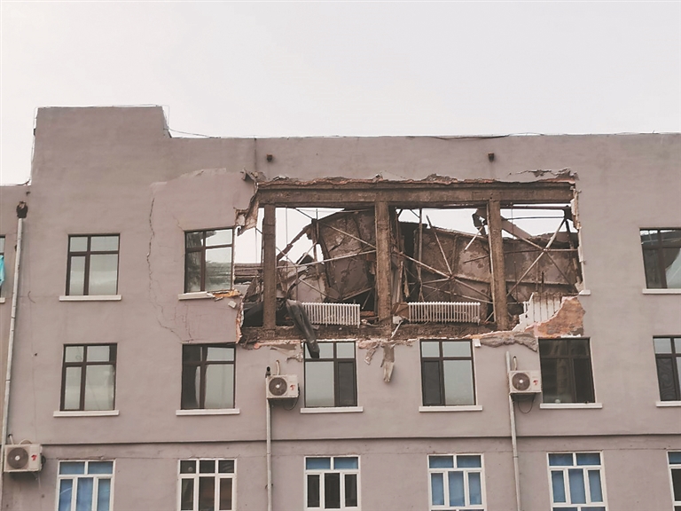 记者在坍塌楼体后身看到,7楼的棚顶已脱落至7楼室内,楼体一侧3个窗户已全部脱落,室内的暖气片裸露在楼外,多名消防员出入救援现场。