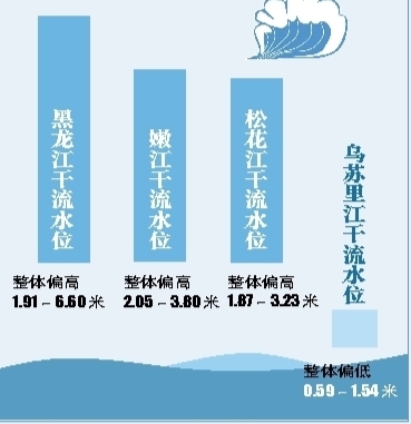与历年同期相比,4条大江,黑龙江干流水位整体偏高1.91~6.60米;嫩江干流水位整体偏高2.05~3.80米;松花江干流水位整体偏高1.87~3.23米;乌苏里江干流水位整体偏低0.59~1.54米。18条中河,绥芬河水位基本持平,额木尔河、甘河、呼兰河、呼玛河、讷谟尔河、诺敏河、汤旺河、通肯河、逊毕拉河、雅鲁河等10条河流水位偏高0.35~1.73米;拉林河、蚂蚁河、牡丹江、穆棱河、挠力河、倭肯河、乌裕尔河等7条河流水位偏低0.32~1.94米。