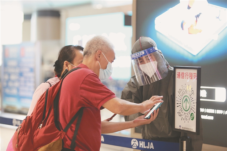 哈尔滨机场在候机楼各出入口常态化设置测温点,对进出港旅客及进入航站楼的人员100%测温、100%健康码查验。所有进入航站楼内的旅客和工作人员必须全程规范佩戴口罩。出港旅客须出示健康码、接受体温检测。