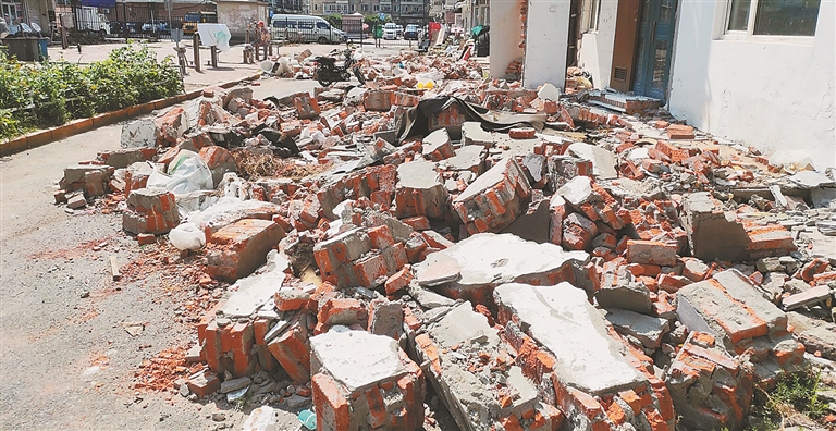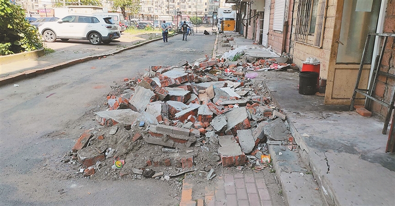 生活报讯 (记者李威兵文/摄) 9日,哈尔滨市民王先生通过本报热线反映,哈市道外区南棵绿荫小区内私建被拆除后,建筑垃圾一直没人清理,已在院子里堆了半个月了,不仅挡路,还经常绊脚,给居民出行造成不便。当日,记者向负责该地区的火车头街道办事处了解情况,工作人员表示,应该由拆除私建的施工方进行清理,已催促施工方,施工方正在陆续清理,将于近日全部清除。