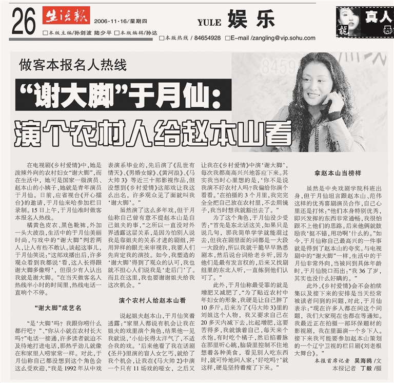 在当天做客名人热线半个小时的时间里,热线电话一直响个不停,读者就像和家里人唠家常一样,一点儿都不见外,比如:“你是赵本山的小姨子,接这个角色算是‘走后门’不?”“你是不是就是东北农村人呀,演的可太像了”……这边,于月仙也是直来直往,“我要是不适合,姐夫才不用我呢。很早,家里人都说有机会让我在姐夫的戏里演个角色,结果他一见我就说,‘小仙长得太洋气了,不适合我的戏。’后来他看了我在话剧《圣井》里演的盲人女乞丐,就让我在《马大帅2》中演一个只有11场戏的哑女试试,之后才放心地让我在《乡村爱情》中演的‘谢大脚’。你说,这算‘走后门’不?”读者再问“你岁数是不是挺大了,不方便说吧”,于月仙脱口而出:“我36岁了,这有啥好瞒的。”