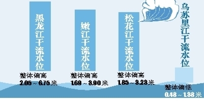 与历年同期相比,4条大江,黑龙江干流水位整体偏高2.05~6.75米;嫩江干流水位整体偏高1.69~3.90米;松花江干流水位整体偏高1.85~3.23米;乌苏里江干流水位整体偏低0.48~1.38米。18条中河,呼兰河、绥芬河等2条河流水位基本持平;额木尔河、甘河、呼玛河、讷谟尔河、诺敏河、汤旺河、通肯河、逊毕拉河、雅鲁河等9条河流水位偏高0.45~1.62米;拉林河、蚂蚁河、牡丹江、穆棱河、挠力河、倭肯河、乌裕尔河等7条河流水位偏低0.31~1.96米。